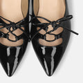 甲部分の細リボンとコード結びのレースアップが印象的なフラットシューズ。デイリーに使いやすいおしゃれな一足です。